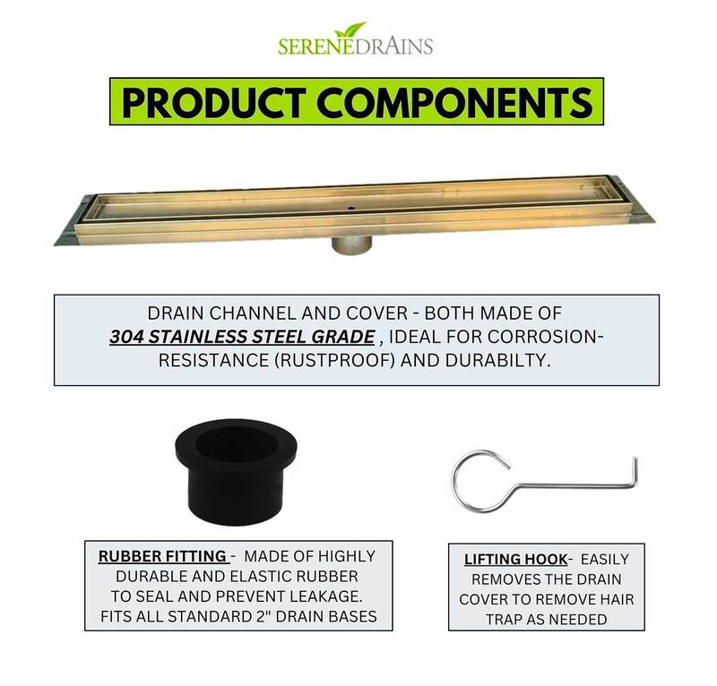 SereneDrains Gold Tile Insert Linear Drains offer a stylish solution for shower and bathroom designs. These drains blend seamlessly with the floor, contributing to a minimalist appearance. The tray’s easy removal simplifies maintenance and cleaning, ensuring a hassle-free experience. Imagine your stunning new shower with this tile insert linear drain merging with your chosen bathroom tiles or mosaic. Its low-profile design highlights the beauty of your tiles, creating a cohesive and eye-catching aesthetic.