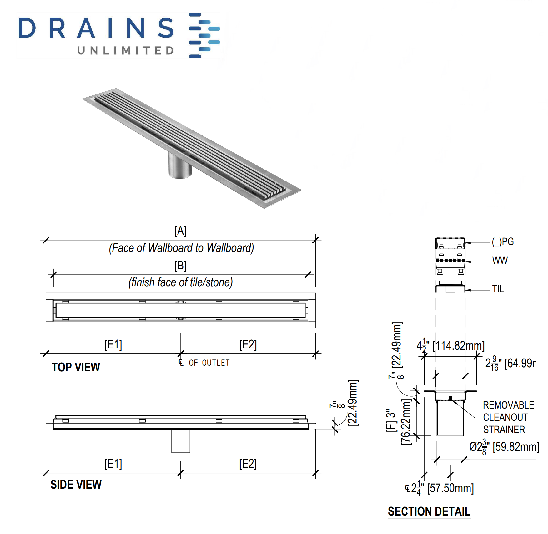 Available Size: 29", 31", 33", 35", 39", 41", 43", 47", 53", 59", 65", 71" (Drains are measured at the outer edge of the flange. The visible grate is approximately 2" shorter than the total drain size).