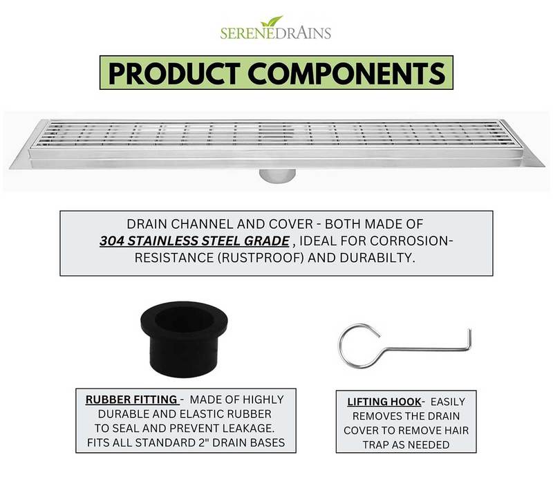 Drain Includes: stainless steel channel body & grate, puller key, rubber fitting, hair trap, waterproofing membrane sheet around the drain flange (not required but included), Installation Instructions.