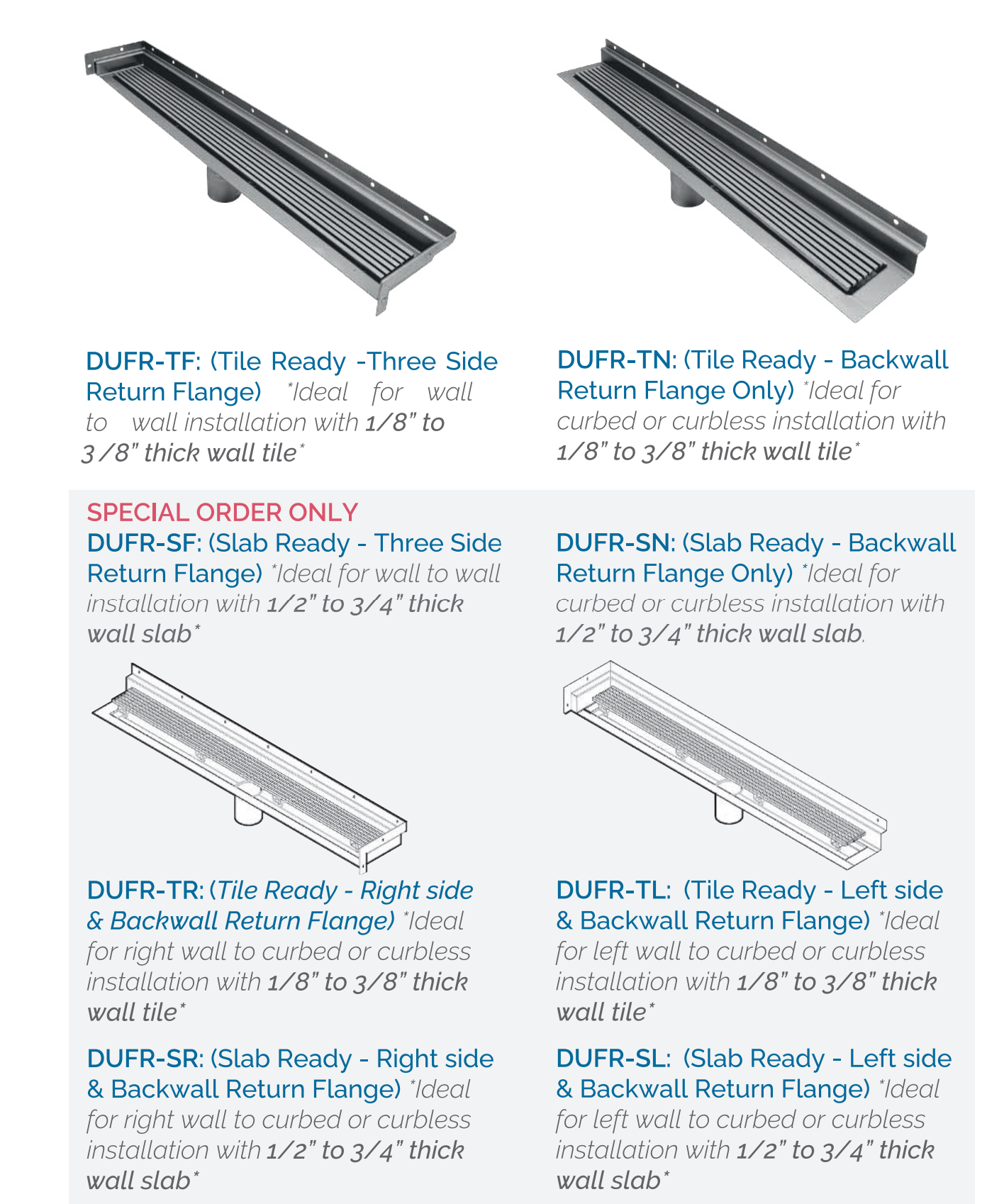 1. The Backwall Return Flange Only is ideal for curbed or curb less installations with 1/8" to 3/8" thick wall tiles