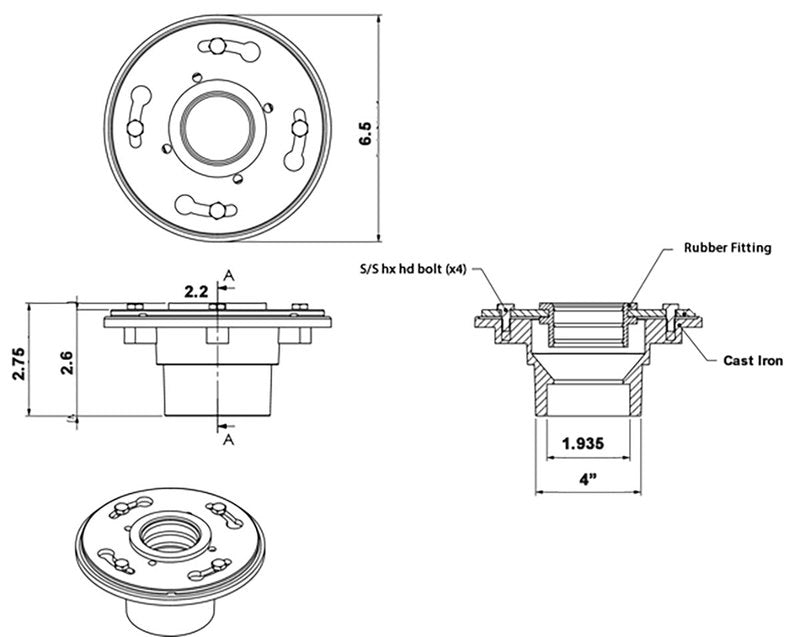 Cast Iron 4 Bolt Drain Base with Rubber Fitting & Hair Trap