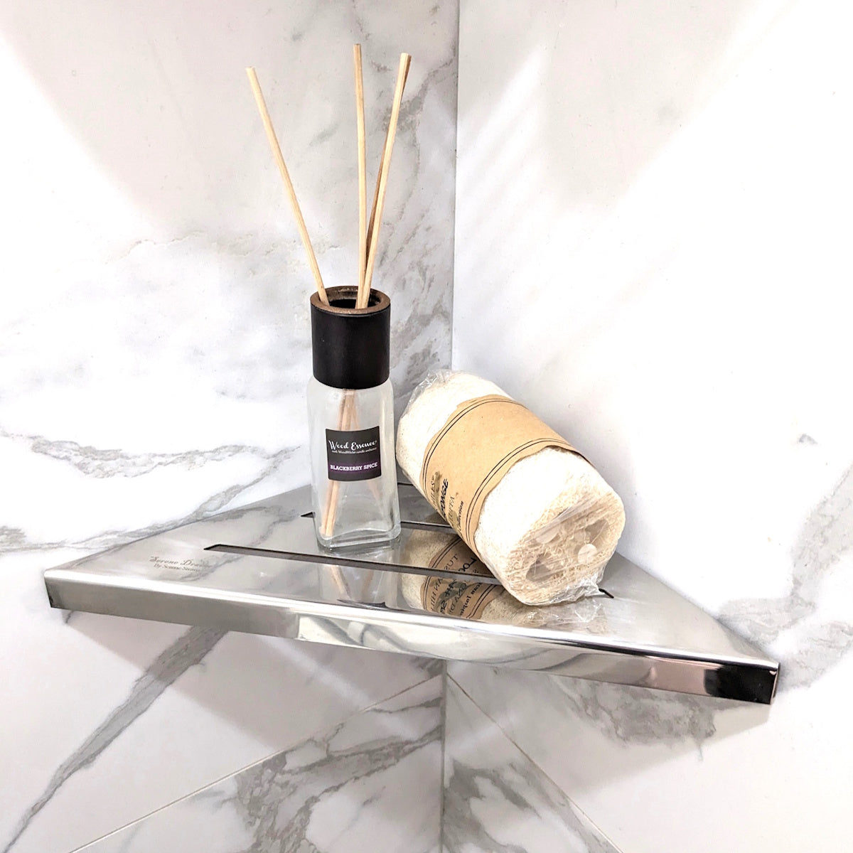 Corner Shower Caddy, 9 Inch Wall Mount Triangle Shower Shelf, Polished Chrome Stainless Steel Shower Shelf or Foot Prop by SereneDrains