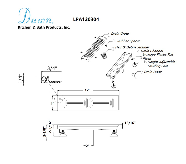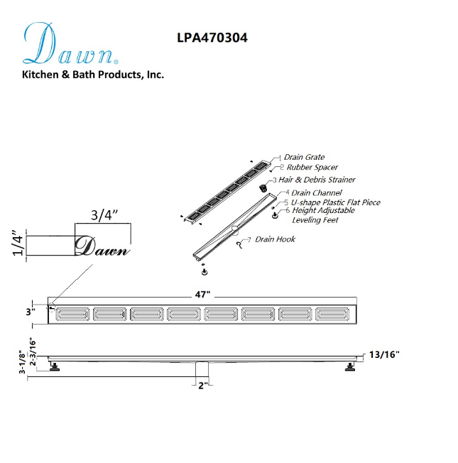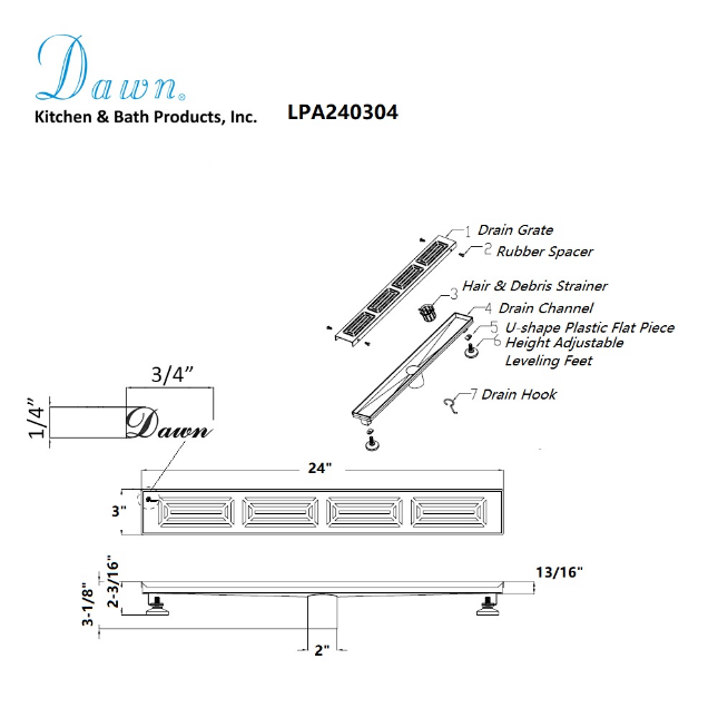 Dawn USA Luxurious Adjustable Linear Shower Drain is crafted with superior workmanship to ensure the highest quality and are available in over 20 grate designs to suit the décor of your bathroom. Made from 6-gauge, 9-gauge, 11-gauge, 14-gauge, or 18-gauge 304-type stainless steel (depending on the design), Dawn shower drains are durable and offer light to heavy-duty solutions. They are highly resistant to temperature variations, provide excellent flow capacity, and are easy to install in almost any construction project.