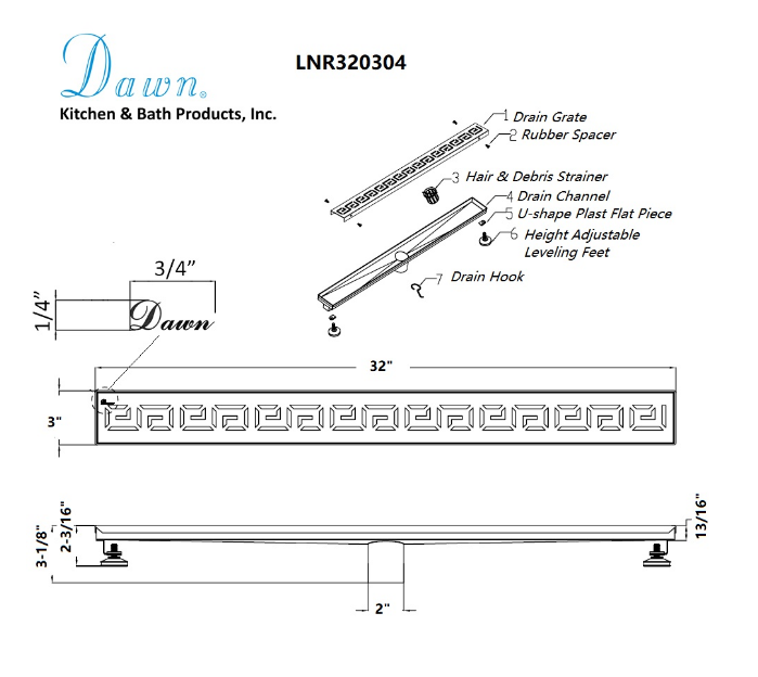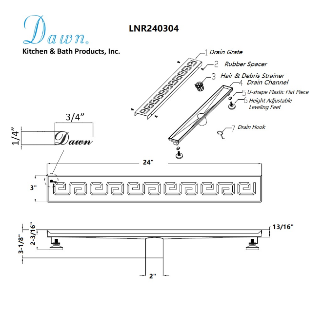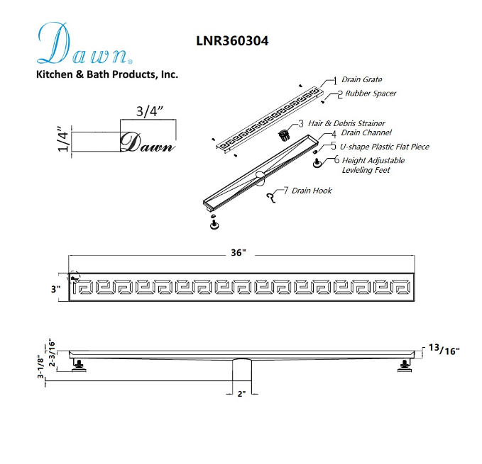 Dawn USA Luxurious Adjustable Linear Shower Drain is crafted with superior workmanship to ensure the highest quality and are available in over 20 grate designs to suit the décor of your bathroom. Made from 6-gauge, 9-gauge, 11-gauge, 14-gauge, or 18-gauge 304-type stainless steel (depending on the design), Dawn shower drains are durable and offer light to heavy-duty solutions. They are highly resistant to temperature variations, provide excellent flow capacity, and are easy to install in almost any construction project.