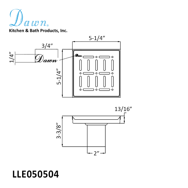 Dawn® 5 Inch Square Shower Drain, Loire River In France Series (push-in outlet) 14G, 304 Stainless Steel, Polished Satin Finish LLE050504.