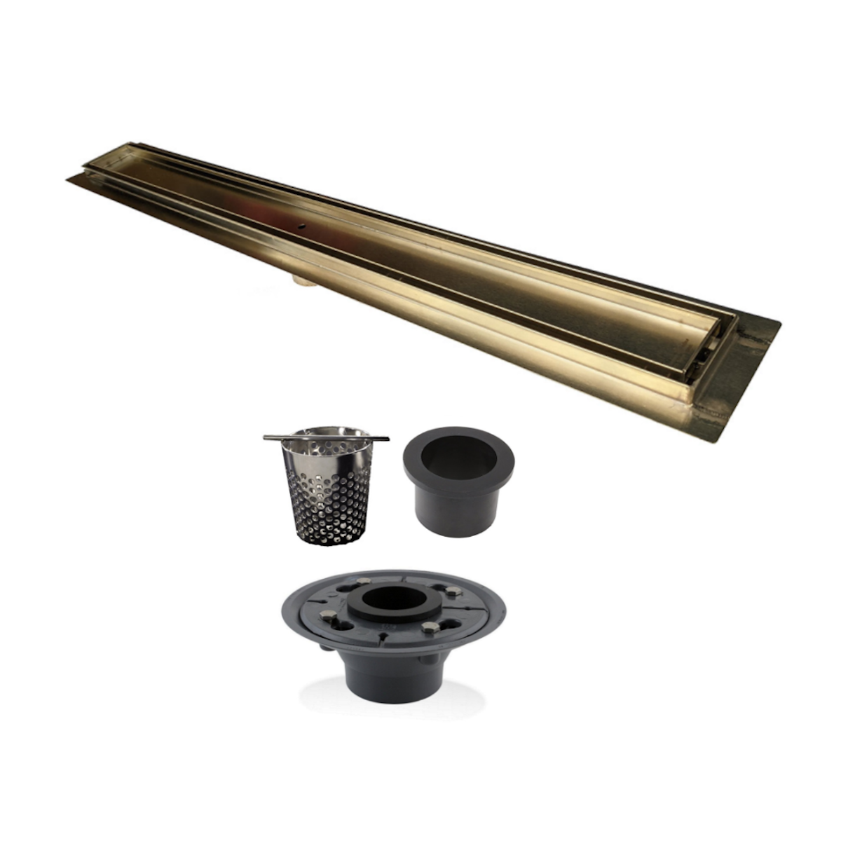 Upgrade your shower with this all-in-one gold linear drain kit, designed for smooth, hassle-free installation and a luxurious finish. The kit includes a sturdy flange base for secure mounting and a removable hair trap to help prevent clogs. Whether you're a contractor or a DIY enthusiast, this drain delivers a clean, modern look with dependable performance.