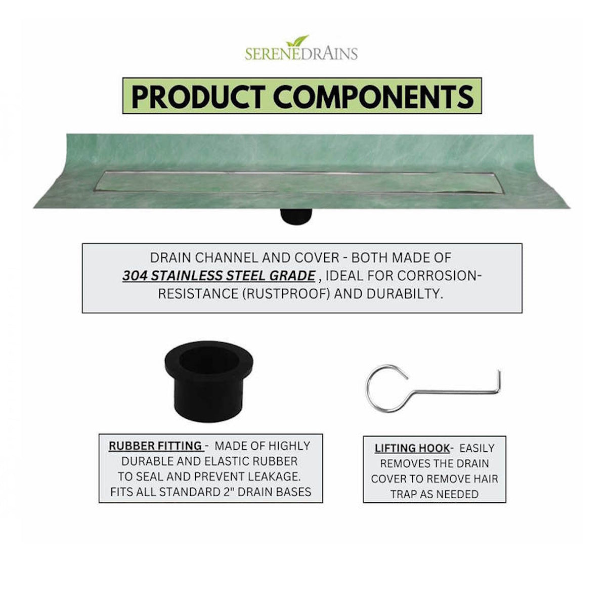 SereneDrains Invisible Linear Shower Drain Kit with Hair Catcher and Flange Base