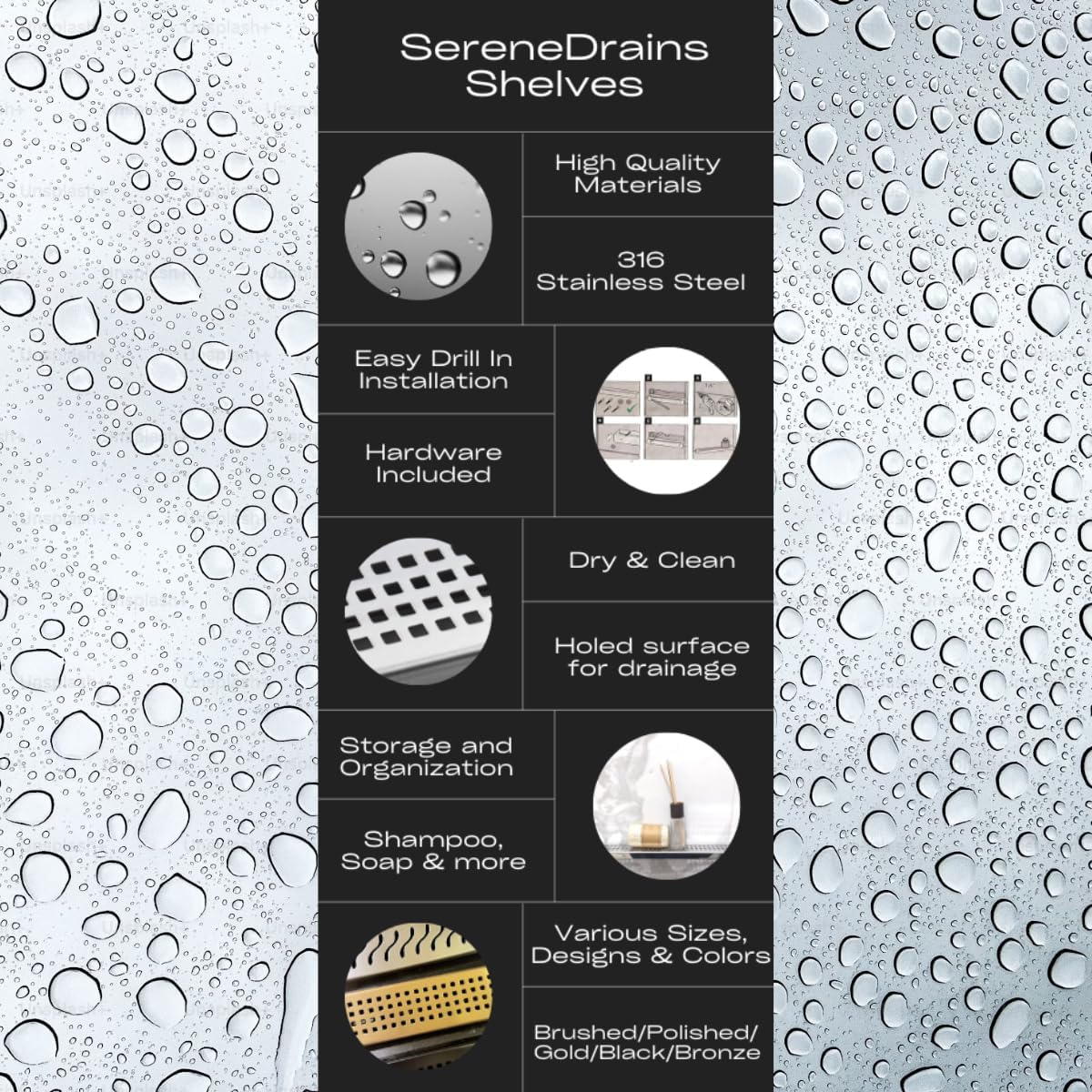 Design your shower with the SereneDrains Stainless Steel Shower Shelf, ideal for organization and long-lasting durability. Built for humid environments, these rust-proof shelves provide both functionality and style. Perfect for keeping shampoo, conditioner, and essentials neatly arranged, they combine modern design with practical performance for a clean, clutter-free shower.